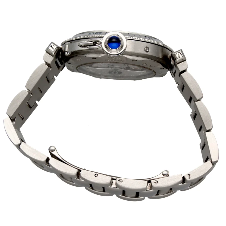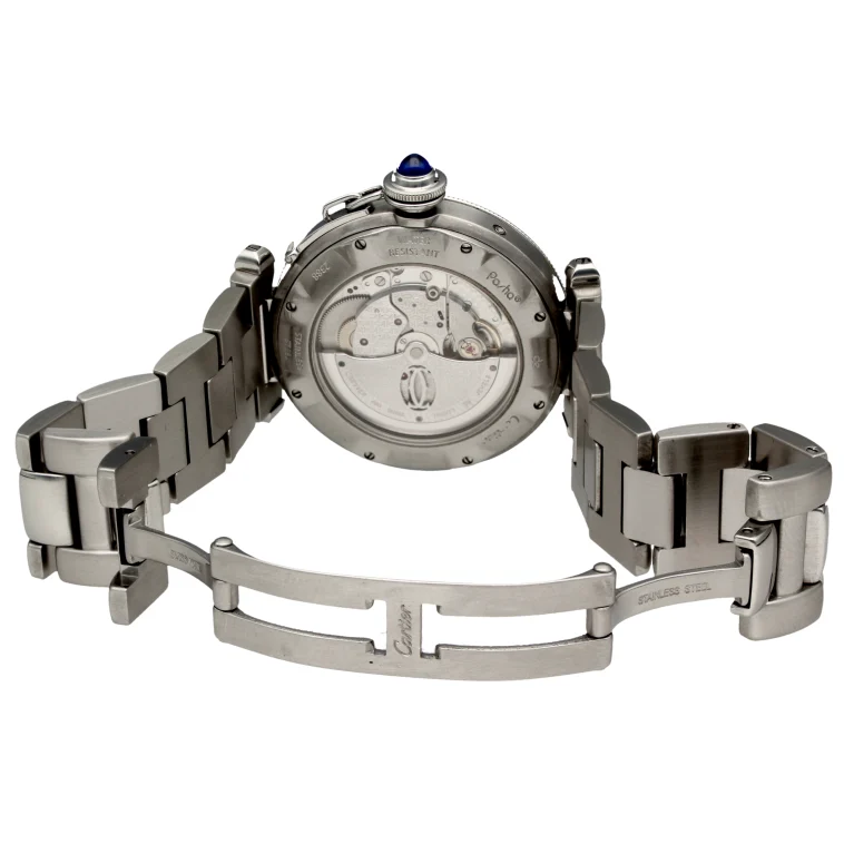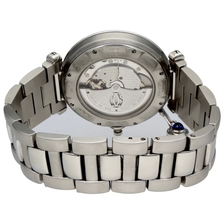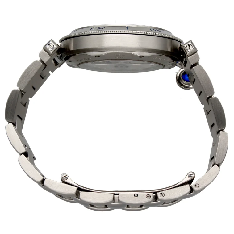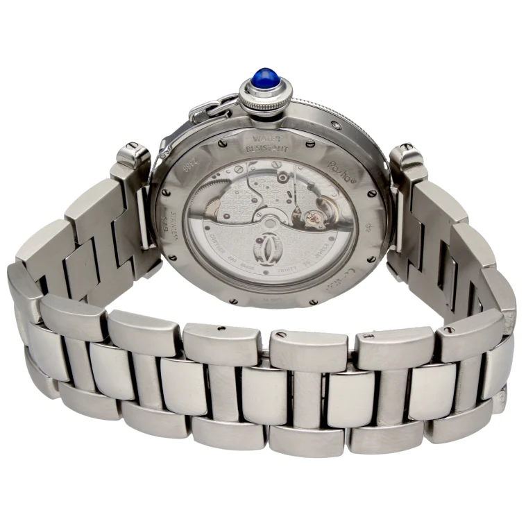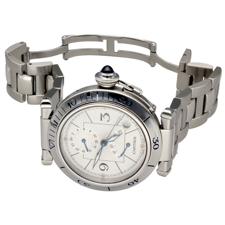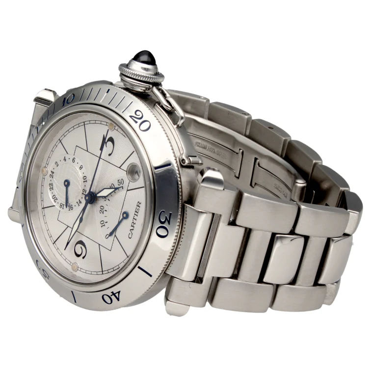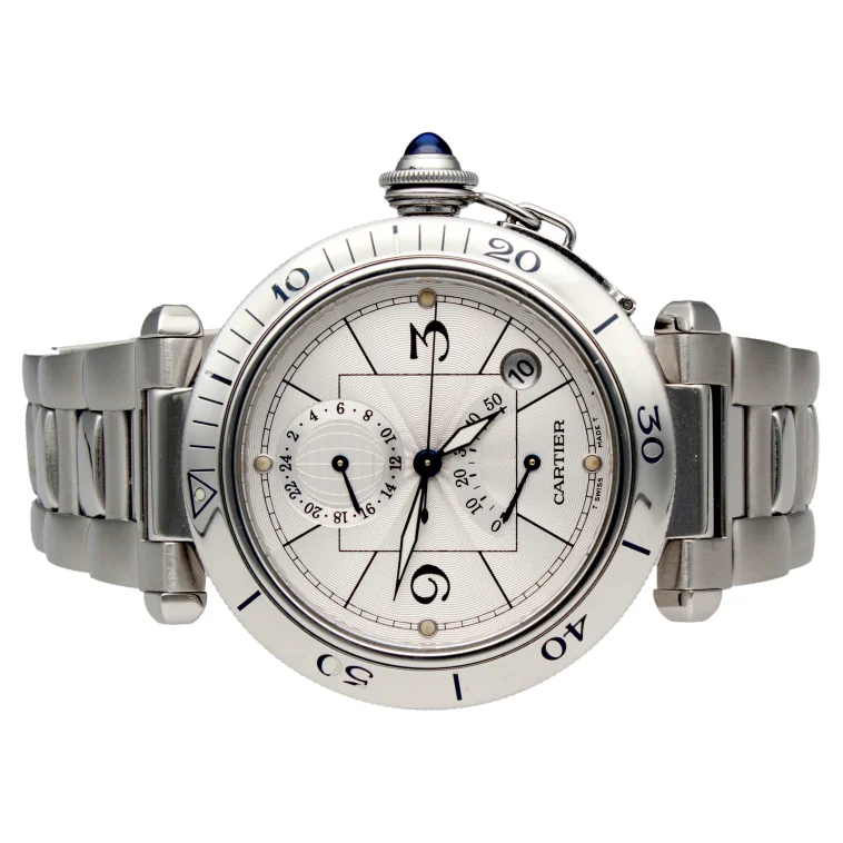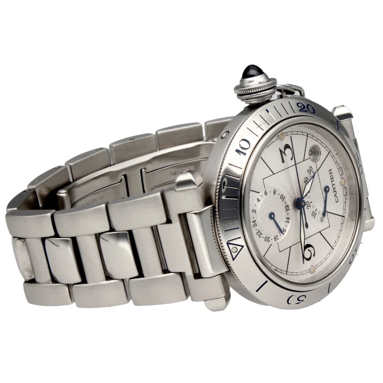 Affascinante Cartier Pasha in acciaio, referenza 2388, caratterizzato dalla funzione doppio fuso orario, una complicazione elegante e pratica che distingue questo modello all’interno della collezione Pasha.