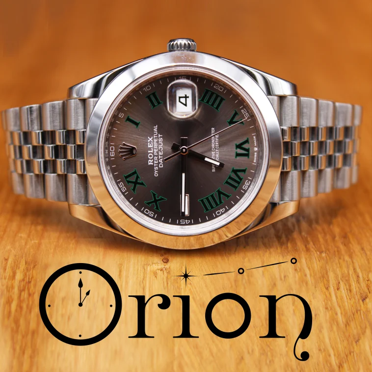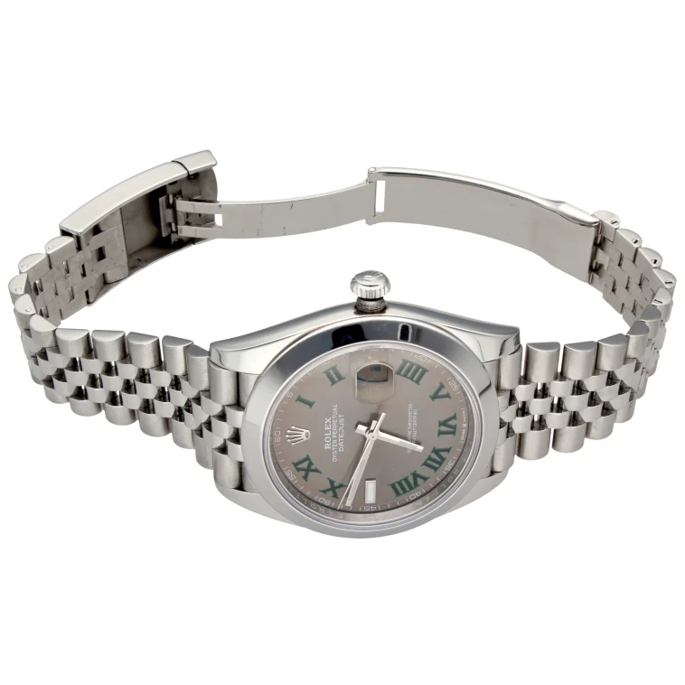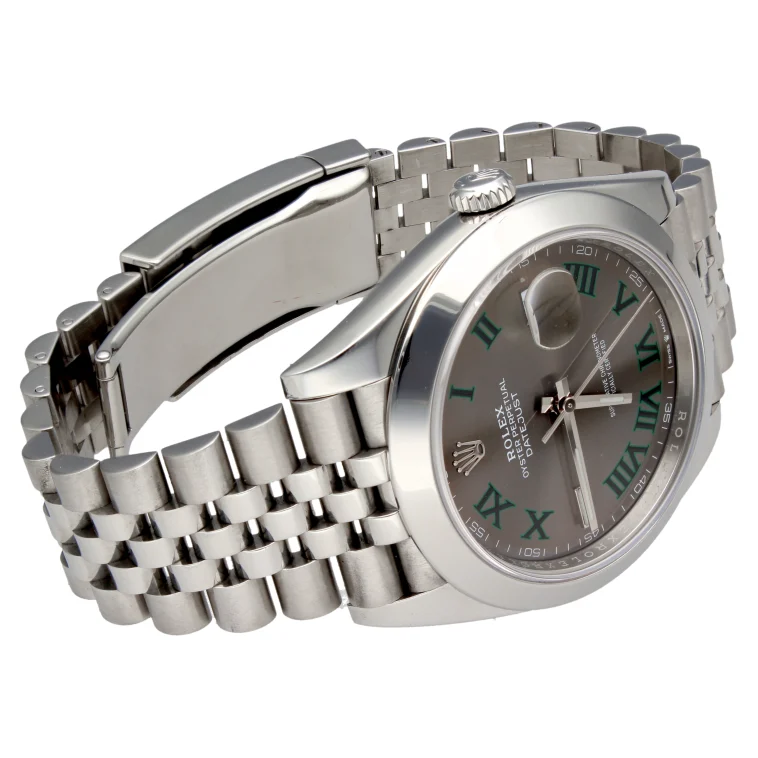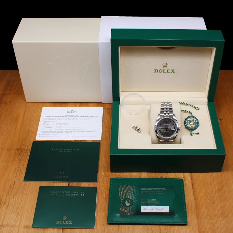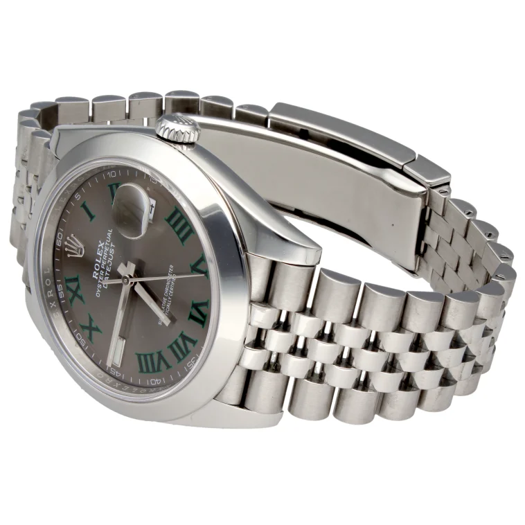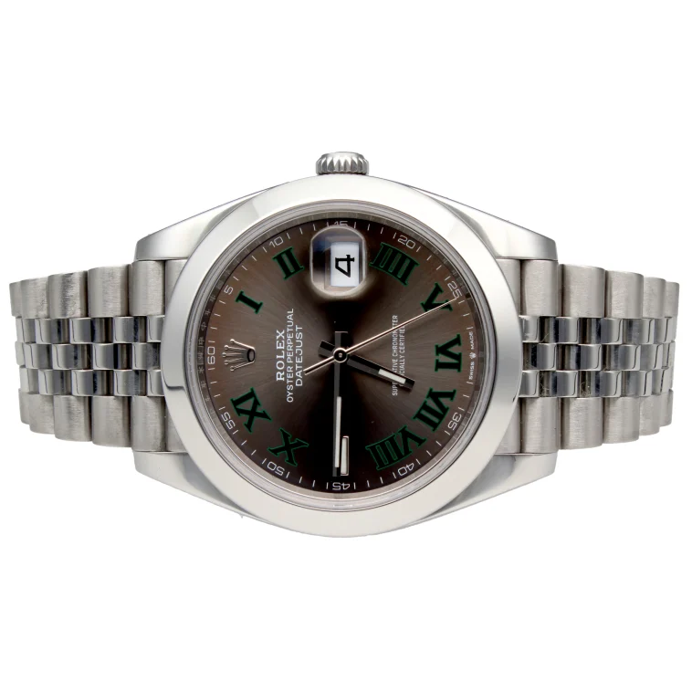 Rolex Datejust 41 referenza 126300 con iconico quadrante “Wimbledon” grigio ardesia e numeri romani verdi, una delle configurazioni più richieste della collezione moderna. Cassa in acciaio da 41 mm abbinata al bracciale Jubilee che dona eleganza e sportività allo stesso tempo. Esemplare di 11/2022, completo di corredo.